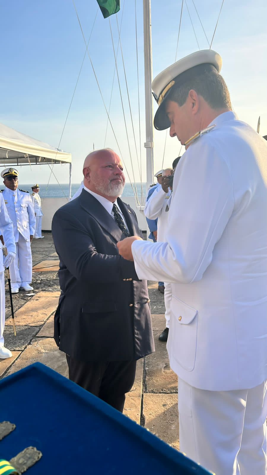 . A entrega foi realizada pelo Vice-Almirante Gustavo Calero garrida Pires, durante a Cerimônia Militar alusiva ao Dia do Marinheiro realizada na tarde da última sexta-feira (12), no Forte de Santo Antônio (Farol da Barra). A honraria é concedida em reconhecimento aos serviços de divulgação e fortalecimento das tradições da Marinha do Brasil.
