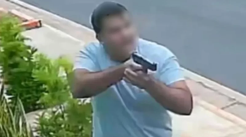 De acordo com as imagens, dois homens armados chegaram em um HB20 preto e abordaram a vítima de 23 anos, que estava acompanhada da família em frente à residência.
