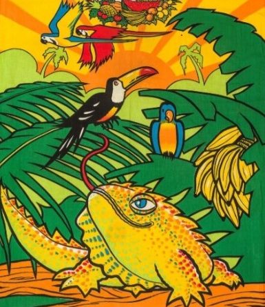 Idealizado pelo designer de fantasias, o abadá traz em suas cores e desenhos, claras referências ao modelo de estreia do Camaleão em 1986. “Nos anos 80 ainda tinha uma influência do tropicalismo e eu quis fazer uma homenagem àquele mundo tropical que a gente vivia, epresentando um pouco aquela questão da natureza, das florestas.”, comentou Pedrinho da Rocha.